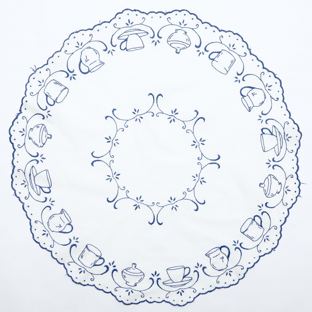 こちらは20年前にお邪魔したチェコの田舎のお宅に住んでいらしたお婆様からお譲りいただいたテーブルクロスです。彼女が若い頃に手刺繍を施したクロスの中からの一枚です。白い厚手のコットンに、青い糸でティーカップやシュガーポットなどの刺繍が施されています。直径は74cmです。木製のテーブルにブルーのカラーがよく合って空間を素敵に演出できます。一つひとつ丁寧に刺された針仕事の温かみをお楽しみ頂けます。目立った汚れなどなく、保管の良かったようで状態も良いものです。