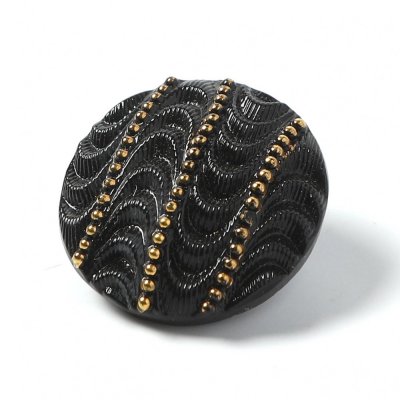 こちらはガラスボタンの見本帖に縫い付けてあったガラスボタンです。1990年代頃の見本帖で比較的新しいものです。黒いカラスを使用したボタンでぽっこりとした形、表面は波打つような模様が施され、ゴールドの細かなドットのラインがアクセントになっています。シックな雰囲気が魅力的です。私の手元に一つしかないボタンで、コレクションの中に保管していたボタンです。状態も良いものです。セルフシャンクのボタンです。