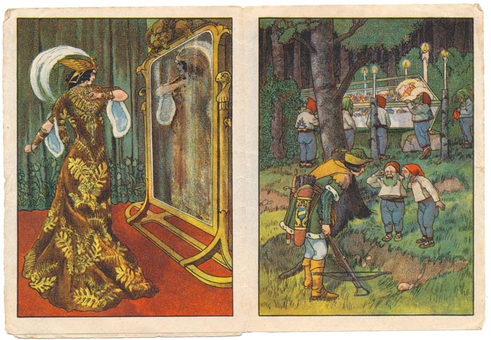 チェコの古いおとぎ話の冊子「白雪姫」。全8ページのミニミニ冊子なのですが、こちらは残念ながら最後のページが失われていて、全6ページになっています。戦前のとても古いものです。表紙を含めて3つの絵が収録されています。紙ものコレクターにお勧めの年代物です。角に折れ、また全体的に汚れ、経年の風合いがあります。見開きのイラストがアールデコ調で美しいので、訳あり品としてお求めやすい価格で出品しております。