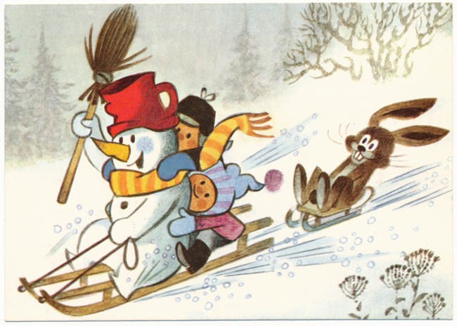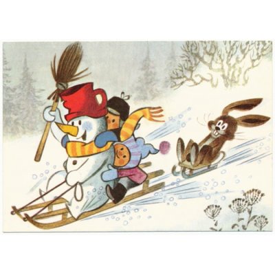 クルテクなどで有名なイラストレーター、ズデニェック・ミレルの古いポストカード。ズデニェック・ミレルはもぐらくん(クルテク)を描いたチェコを代表するイラストレーター。こちらは子供たちやうさぎとそり遊びをするスノーマンの愛らしいイラストです。即にスノーマンにしがみついている子供たちの描写が秀逸!先日そり遊びをしてきたばかりですので出品しました。:)ズデニェック・ミレルが2011年に亡くなってしまってから、ミレルの関係の古い商品はこちらでもコレクターの間人気の上昇しているアイテム。大体1970-80年代のものです。状態も良好の未使用品です。