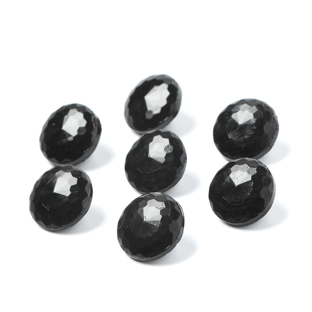 こちらはオールド・ヴィンテージのジェットガラスのボタン。ジェットガラスは太陽の光も通さない漆黒のガラスで現代では作ることのできない貴重なガラスです。こちらのガラスボタンは1.3cmの丸いボタンで、表面には細かな面取りが施されています。ハーフマットの柔らかな輝きがあり、面に合わせてチラチラと光を反射するボタンです。20世紀初頭の1920年代頃までの古いアンティークです。