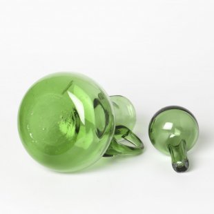 こちらはチェコスロヴァキア時代のガラス工芸品の水挿し。吹きガラスで職人さんが作ったものです。20年前にアンティークショップで入手して以来、当店で長く保管されていたお蔵出しです。熟練した職人さんらしく、水差しの栓までガラス製です。店長横山、透明の緑色のガラス大好きです。水差しやビネガー入れなどに使えますが、インテリア雑貨として使えるほど、格好の良いバランスの取れたお品と思います。またお花を活けたりするのも良いかもしれません。底の部分に不純物が入っています。またガラスには気泡も入っていたりしますが、製品としては問題のないものです。内部には汚れなどありません。チェコからのとっておきです。