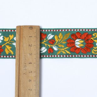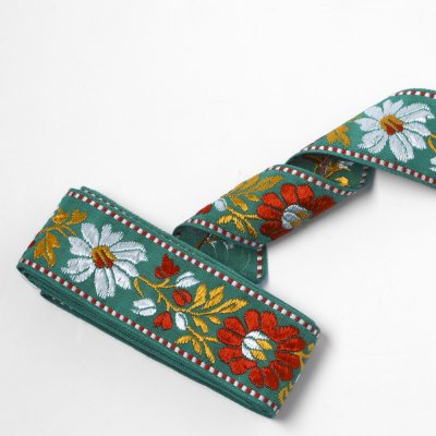 こちらはチェコスロヴァキア時代のデッドストックの民族衣装のリボン。20年ほど前に仕入れてそのまま保管しておいたものです。チェコでは民族衣装のリボン生産がある特定の数種類のみになってしまい、昔作られていた民族衣装のリボンにお目にかかるチャンスは今ではほとんどありません。このリボンも廃盤になってしまったデザインの一つです。グリーンの地に白と赤のお花柄の艶やかさが魅力です。現在では入手困難なヴィンテージです。状態もとても良いものです。