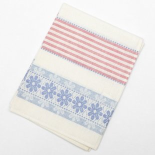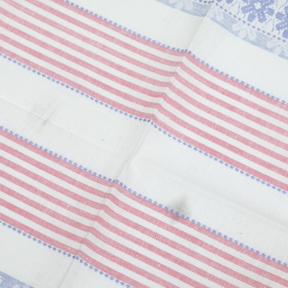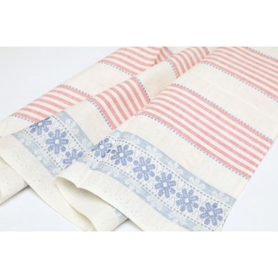 こちらはチェコスロヴァキア時代のキッチンクロス。デッドストックの未使用品です。リネンのクロスです。白地にピンクのストライプ、ブルーのお花のガーリーでとても素敵なクロスです。パリッとした昔の丈夫で上質な素材で、使えば使うほど味と吸水性が出てくる優れものです。50x 70cmと割と使いやすいサイズで台所仕事に活躍してくれそう。もちろん台所にも明るい彩りを添えてくれます。布の上部にはフック用のテープも縫い付けられています。お布に2箇所、薄いグレーのシミが入っていますので訳あり商品として、お求めやすい価格にてご提供です。デッドストックとしてノリの効いた状態を保ったまま出荷したいのであえて洗濯をしておりません。詳しくは写真でご確認の上お求めください。長く愛して頂けるチェコの素敵なレトロ商品です。