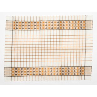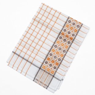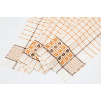 こちらはチェコスロヴァキア時代のキッチンクロス。デッドストックの未使用品です。社会主義時代のリネン製品の国営企業TEXLENからのお品です。(残念ながら中国製などのリネン製品に押され、2007年に閉鎖、今では存在しない会社です。)白地にオレンジとブラウンのライン、またコーヒー豆のような模様の入ったレトロで可愛いクロスです。麻の量が多いようでパリッとしたリネン特有の硬さがあります。使えば使うほど味と吸水性が出てくる優れものです。50x 70cmと割と使いやすいサイズで台所仕事に活躍してくれそう。もちろん台所にも明るい彩りを添えてくれます。布の上部にはフック用のテープも縫い付けられています。長く愛して頂けるチェコの素敵なレトロ商品です。