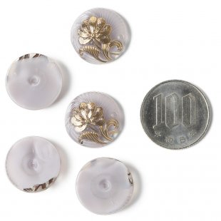 こちらはチェコのガラスボタン工房で製作されている手打ちのガラス・カボションです。直径が約1.8cmあります。淡いパープルとクリアのマーブルの入ったガラスを使用し、表面には優雅なお花のモチーフがゴールドで施された美しいカボションです。大人っぽく優しい雰囲気の仕上がり。こちらは1個売りの値段です。ガラスボタンと同じデザインですが、ボタンではありません。裏には糸通しのリングがないため、アクセ・パーツとして使用される方には大変便利です。