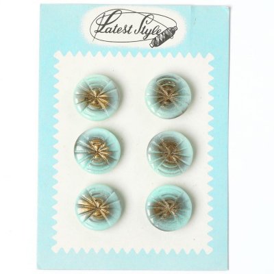 こちらはチェコスロヴァキア時代のヴィンテージガラスボタンカード。最新ファッションと名前のついたシリーズのカードで1.8cmの直径のボタンが6個のボタンが縫い付けられています。ウランガラスを使用し、クリームグリーンの厚みのあるボタンで表面には吹き付けで金彩も施されています。レトロスタイルの可愛らしいボタン。カーディガンのボタンなどにおすすめです。チェコでも貴重なヴィンテージのガラスボタン。現在ではもう製造されていないヴィンテージです。