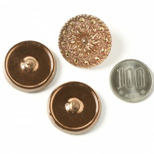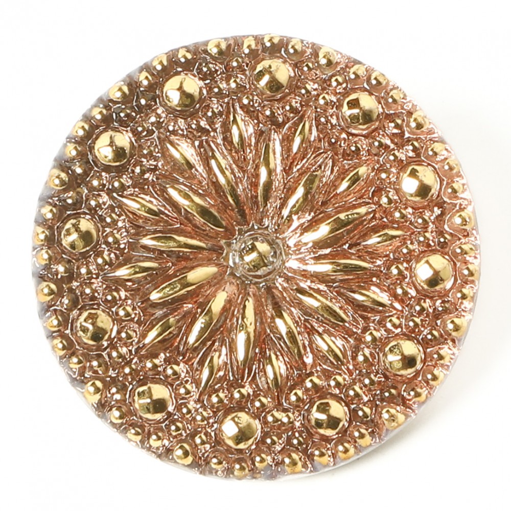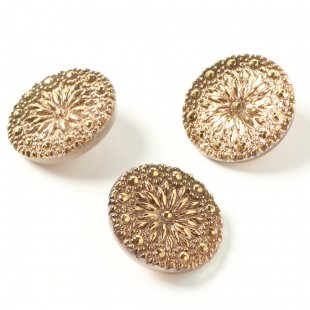 こちらはチェコのガラスボタン工房で製作されている手打ちのガラス・ボタンです。直径が約2.7cmあります。一つ一つ打ち出しや彩色も職人さんの手作業で行われています。裏から金属塗料が塗布され、内側から淡いピンクオレンジに輝きます。夜空に打ち上がった花火のような模様が華やかなガラスボタンです。表面には金彩も施され、華やかな仕上がりです。こちらのボタンは裏のきわに小さな欠けが見られるものがあります。その上から金属塗料が塗布され、工房からは完品として出荷されるものです。また正面からの見た目は全く問題ないものを販売しています。ご了承の上お求めください。