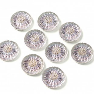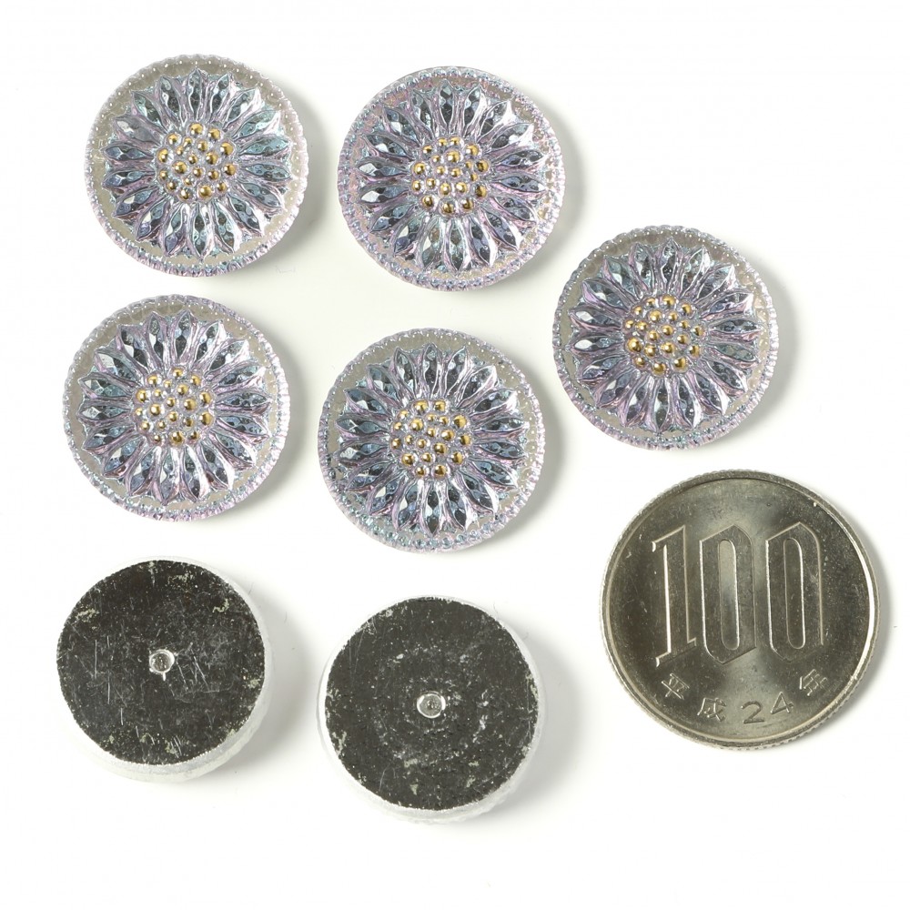 こちらはチェコのガラスボタン工房で製作されている手打ちのガラスカボションです。直径が約1.8cmあります。打ち出しや彩色も職人さんの手作業で行われています。ひなぎくのモチーフで裏から金属塗料が塗布され、奥行きのある人気のヴィトレイル・カラーです。パープルが強めですが、クリアブルーのお色も見え隠れします。おしべには手作業で金彩も施され、柔らかな雰囲気のフェミニンな一品です。複数写っている写真もありますが、こちらは1個での販売になります。こちらはカボションですので、裏面はボタン通しがなく、平らですのでアクセサリー作りの材料としては便利かと思います。