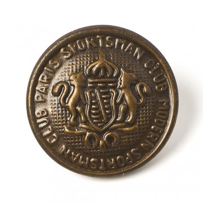 こちらはチェコスロヴァキア時代のヴィンテージ・メタルボタン。錫(すず)製の高級メタルボタンで、A B(アンティークブラウン)のお色。チョコレートのような渋いお色です。こちらは、表面にヨーロッパの王家の紋章をあしらったノーブルでクラシックなメタルボタンで周りにはスポーツマン・クラブ・パリと印字されています。ティサーのメタルボタンの歴史は古く18世紀後半にまで遡ります。工場では今でも職人さんが一つ一つ手作業で制作しています。こちらでティサーのメタルボタンの記事もご覧いただけます。こちらは1950-70年代頃までのヴィンテージ、デッドストックです。状態もとても良いものです。中間空洞ですので、水洗いの洗濯はお勧めしません。また極少量のニッケルが含まれています。洗濯される時は洋服からはずされるのをお薦めしています。ティサーのメタルボタンはとても軽く、アクセサリーのマテリアルとしてもおすすめです。