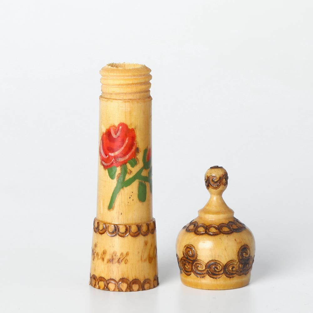 こちらはブルガリアの民芸品、木製の香水入れ。チェコのアンティークバザールで入手です。中には小さな薔薇の香水瓶が入っていて香水として売られている民藝品。こちらは香水の瓶は入っておりません。焼けた針のようなもので手描きで施された模様が入っていて、こちらは大きな一輪のバラが描かれています。表面にはうっすらとニスが塗られています。お裁縫のお針入れとして使うとお裁縫箱が楽しく演出できます。小さいながら手作りの暖かさが感じられる木工民藝です。とんがり帽子のぽっちもなかなかキュート。蓋も割と滑らかできちんと閉まります。全体の状態も良いものです。