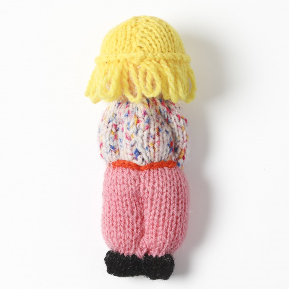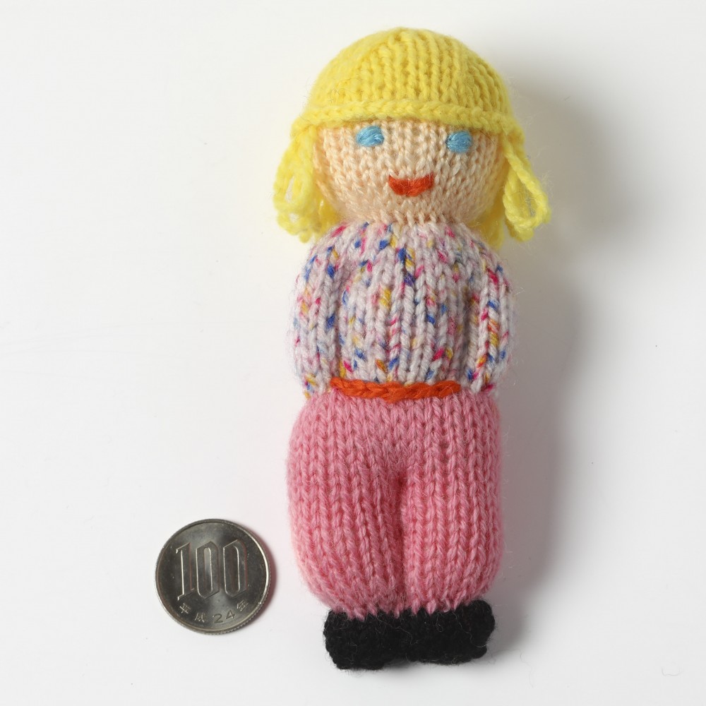 こちらは編み物で作ったお人形。チェコでは今、昔あった家庭のアートがちょっとした人気です。作家の大きな作品ではないけれど、家庭で作成された手作りのアイテムは、チェコでは昔社会主義時代に物資が豊富ではなかったこともあり、昔からなかなか深みのある分野。こちらのお人形さんは家庭の主婦ヘレナさんが新しく編んだ少女のお人形です。今回はブロンドで瞳はブルーのおかっぱの女の子です・・・。オレンジのお口でにっこりおっとりした幸せな表情が素敵です。ピンクがお好きなのか、ズボンもセーターもピンク。とても愛らしいお人形です。