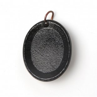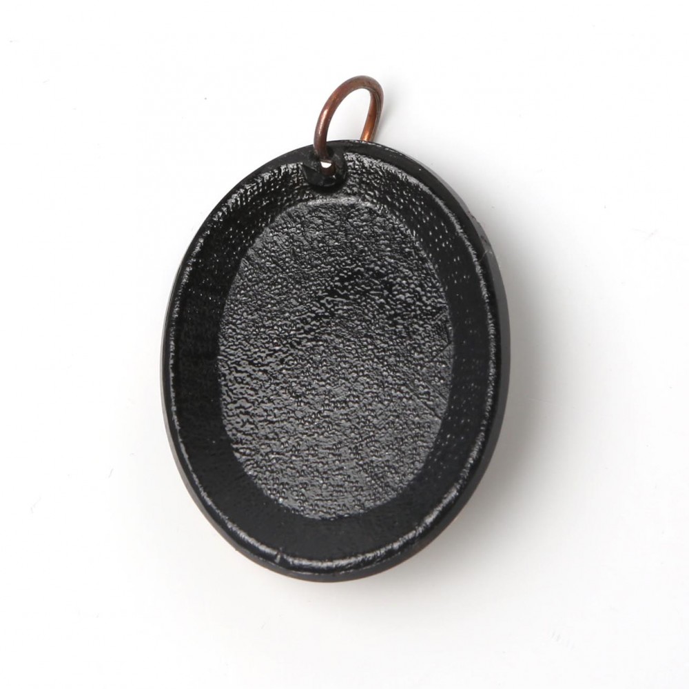 こちらはチェコスロヴァキア時代のヴィンテージ・ブローチ。黒ガラス(ジェットガラス)を使ったクラシックなデザインのペンダントヘッドです。ジェットガラスは現代では使用できない特殊な薬品を使用していて、黒の濃度が通常の黒いガラスと比べて高く、漆黒の色をしています。太陽の光も通さない黒です。現在では作れないガラスで世の中に残っているだけ・・・。ずばり貴重なお品です。表面には光を放射する太陽なようなモチーフが彫りで施され、中央にイミテーションパールが配置されています。周辺の楕円のフレーム部分の装飾も繊細で美しいものです。表面を研磨したのち、手作業で金彩が施されていて、作業にもなかなか手間がかかっています。ノーブルな雰囲気の豪華なペンダントです。ゴールドの塗料に少々焼けが見られます。ガラス部分の縦の長さは4cmと大きめですので、実際に着用されるとパッと人目をひく存在感があります。近年ではなかなか入手の困難な1950-60年代の良品ヴィンテージです。