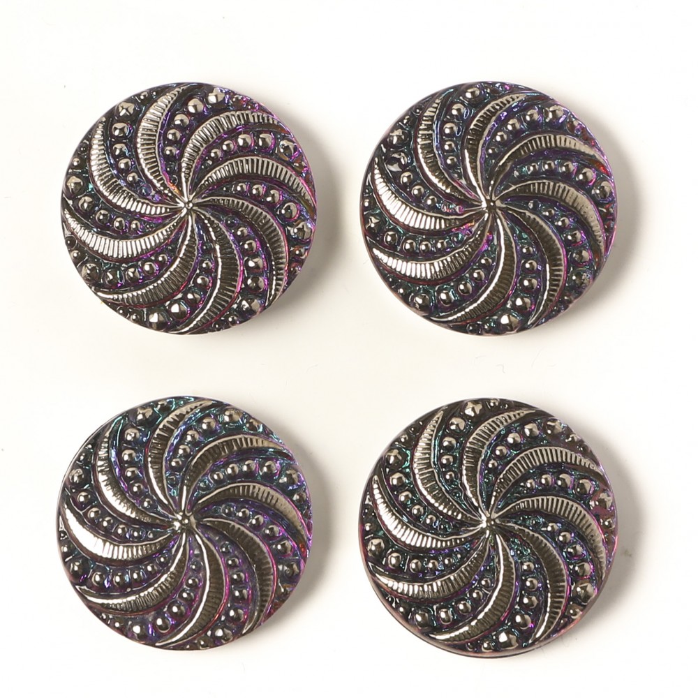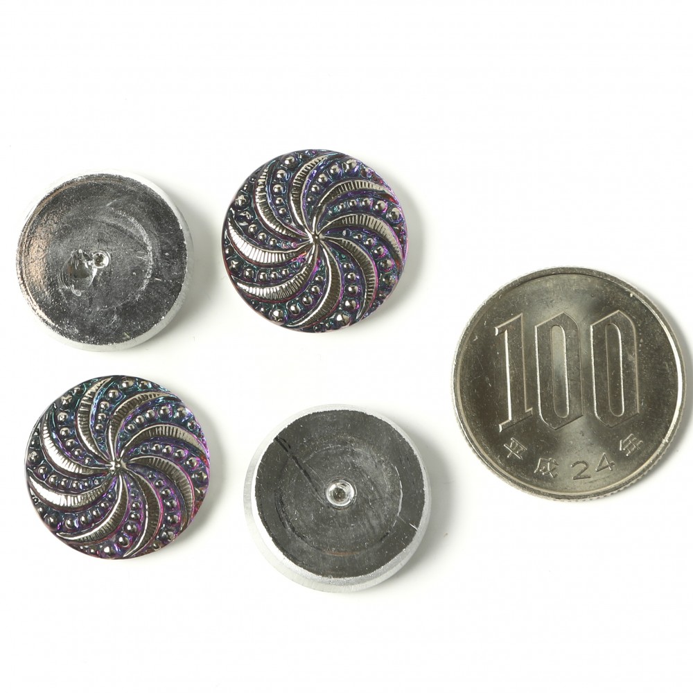 こちらはチェコのガラスボタン工房からのカボション。この度は4つでのセットです。渦巻きの模様のカボションで、裏から金属塗料が塗布されピンクパープルのお色です。角度によってはグリーンのお色も見え隠れします。渦の部分はシルバーです。角度によって様々にニュアンスを変えます。