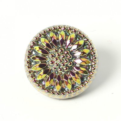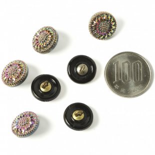 人気のひなぎくのデザインのガラスボタン。直径は1.3cmの小さなボタンです。黒いガラスの表面に金属塗料が塗布され、メタリックピンク&グリーンのお色に仕上がっています。小さいけれど華やかなボタンです。
