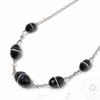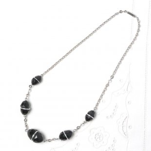 こちらは、チェコスロヴァキア時代1930年のヴィンテージ・ネックレスでガラライトのビーズが使用されたネックレスです。ガラライトはミルクプラスチックとも言われ、牛乳のタンパク質から作られるプラスチックの一種で、柔らかな風合いとあたたかみがあります。ガラライトのアクセサリーやボタンは日本の方にはそれほど馴染みがあるわけではありませんが、ベークライトと並び、ヨーロッパやアメリカなどにコレクターが多く存在する人気のヴィンテージアイテムです。ココ・シャネルも初期のコレクションにガラライトのアクセサリーを使っていたことも知られています。こちらはブラックのガラライトのビーズで楕円形の中央で切断されたようなデザイン。その中央には金属パーツが挟まれています。ビーズの表面には面取りが施され、無駄のないキリッとした美しいデザインです。当時のアール・デコデザインの一品で、シックで洗練された美しいお品。デッドストックで入手したもので、状態は素晴らしいものです。コレクターズアイテムでこちらでも貴重な一品です。