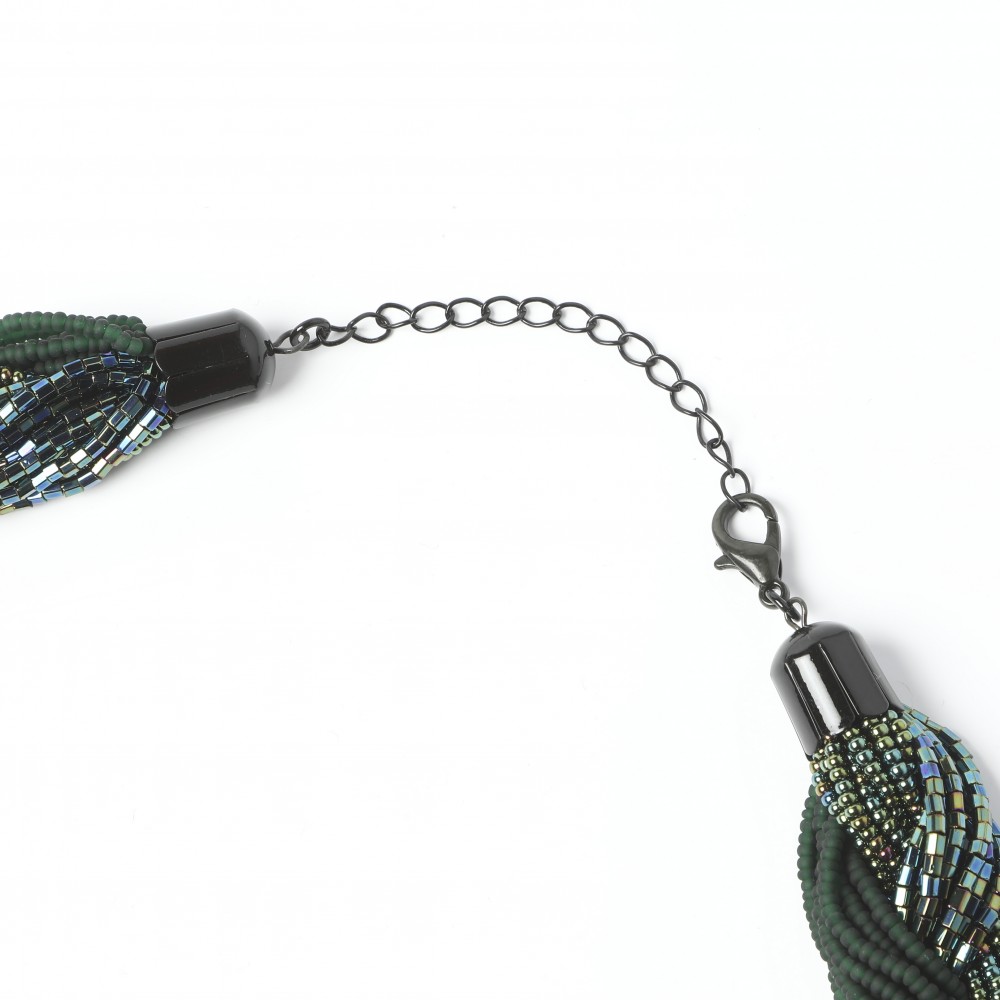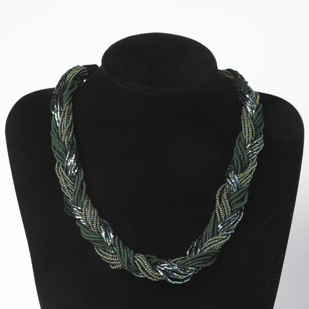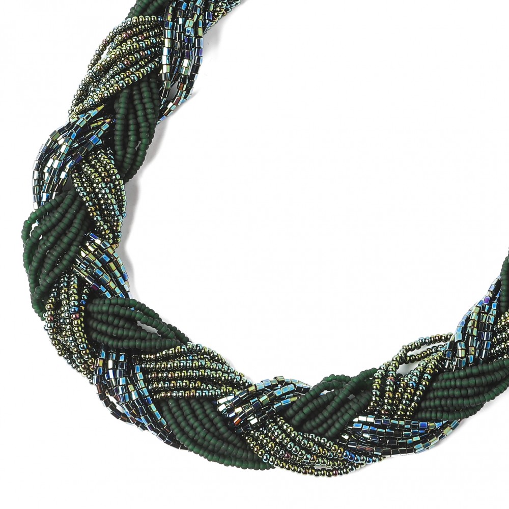こちらはチェコのビーズセンター直営店で販売されているビーズのネックレス。職人さんが丁寧に作っています。グリーンを基調にしたシードビーズは3種類で太い三つ編みに編まれています。エクストラヴァガントでエレガント。大人っぽい装いを演出します。ビーズは艶やかなネタルックの深緑系、筒型ビーズはキリッとしたグリーン、最後は布を質感を思わせるマットグリーンです。デザイナーさんが選んだビーズの組み合わせが秀悦。きっとご満足いただける良品、新品です。