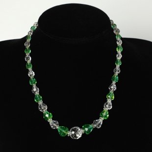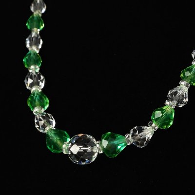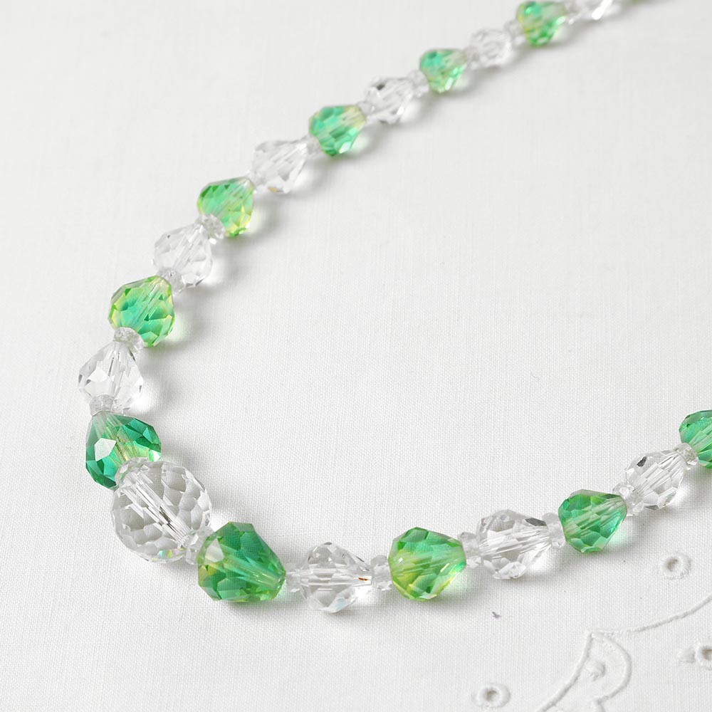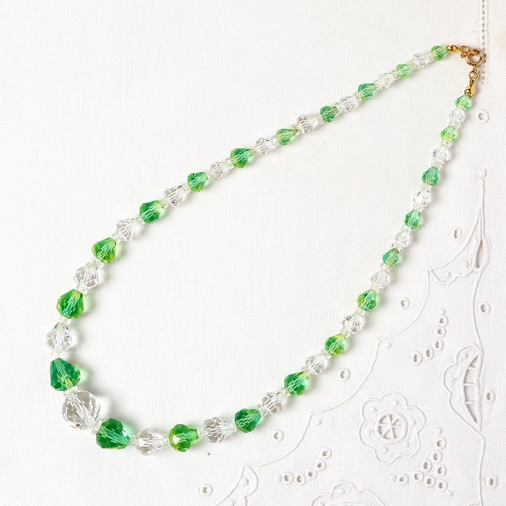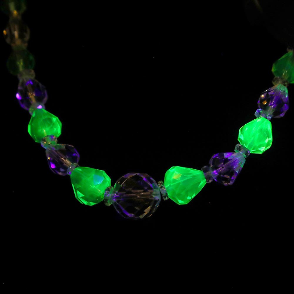 こちらはウランガラスのヴィンテージ・ネックレス。グリーンのガラス石がウランガラスを使用した物です。また大変古いネックレスで1930-1950年代のものです。ウランガラスは少量のウランの含みブラックライトに反応して発光します。こちらのガラス石は特に発光の強いものです。またこちらは大変貴重な職人さんのハンドカットのガラス石で、類似したものをガラスとビジュー美術館でも見ることができます。独特のお色が華やかで人目を惹きます。またクリアなガラスはクリスタルで光の反射率が高く、強く美しい輝きがあります。ボヘミアで昔々職人さんが制作したお品、こちらでもなかなかお目にかかれない逸品です。状態も良好の貴重なコレクターズアイテムとしておすすめです。