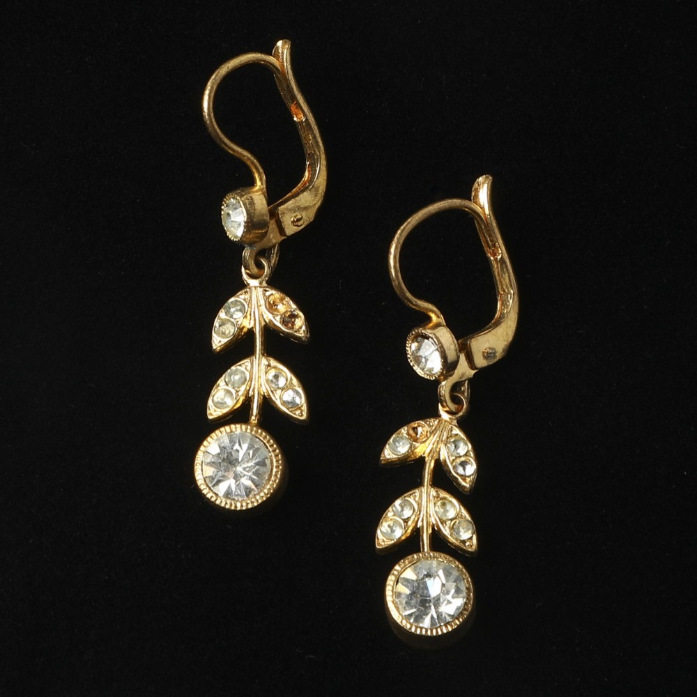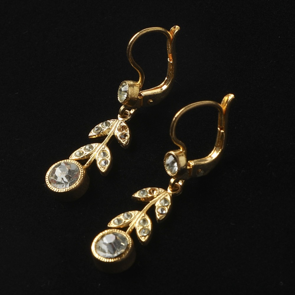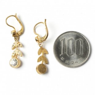 こちらは1930年代のヴィンテージ・ピアス。デッドストックで入手した物です。お花のデザインで、お花部分に丸いクリスタル・カットガラス、葉っぱの部分にも小さなガラス石があしらわれています。クラシカルなスタイルのものです。耳元でチラチラと揺れてとてもキュート。パーツの金属は柔らかいものですので、取り扱いにはご注意ください。「ほとんどアンティーク」の大変古いものですが、状態はとても良い物です。願い年月を経て来た美しさを持つチェコスロヴァキア時代からの良品です。