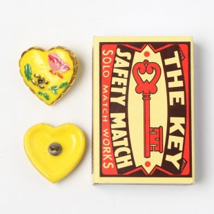 こちらは北チェコのガラスの街で生産された手打ちのハート型のガラスボタン。黄色の不透明ガラスを使用したハートのボタンの表面にはお花と蝶々が描かれています。色付けも手作業で行われてます。周辺は金ラインで縁取りされ華やかさを添えています。ひとつでブローチのような美しさ・・・。ハートのボタンは特にガーリーさで心踊る人気のアイテムになっております。こちらは蝶のカラーの違うボタン2つをセットにいたしました。