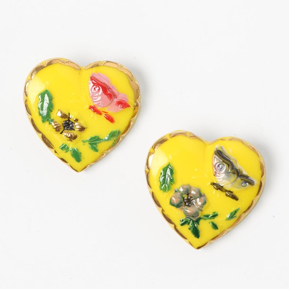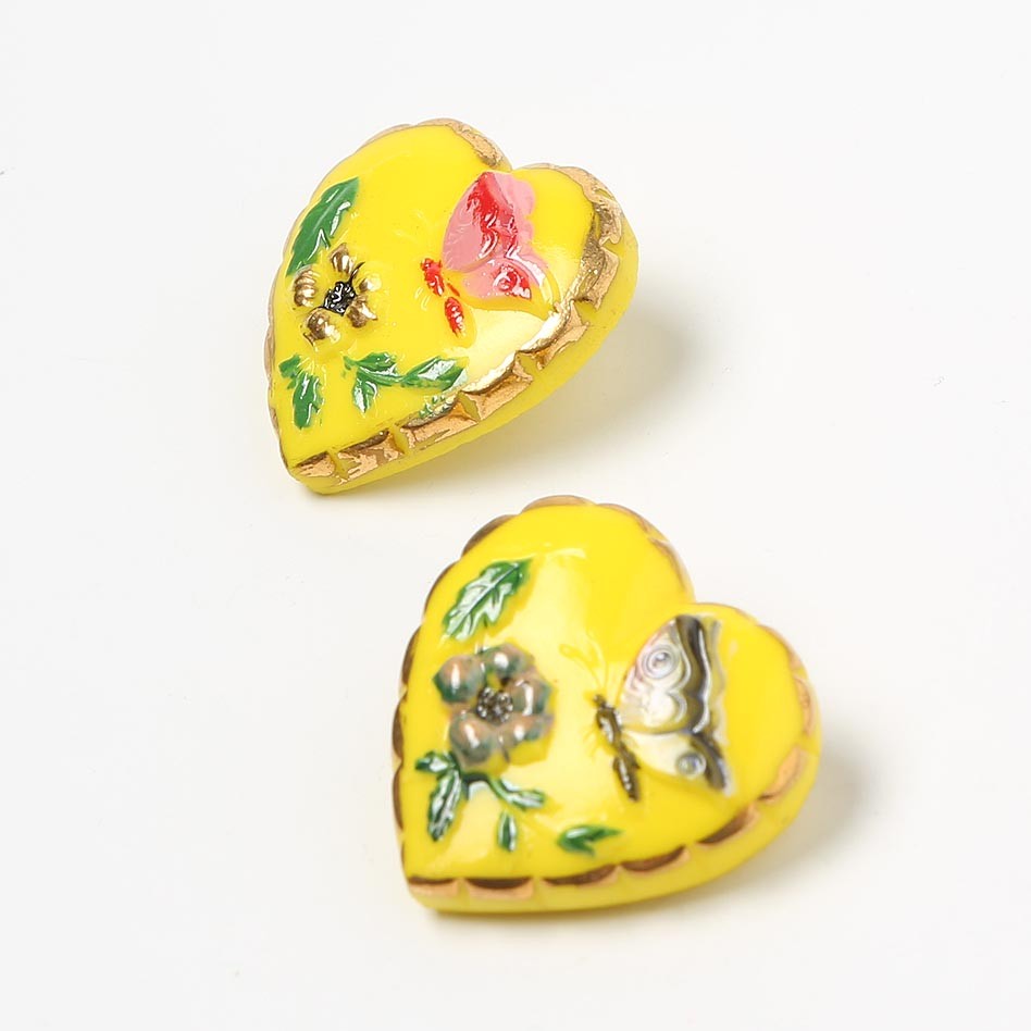 蝶々と花 ハートのガラスボタン イエロー2個セット 希少