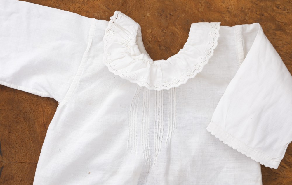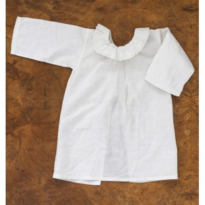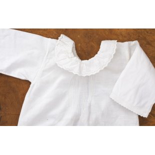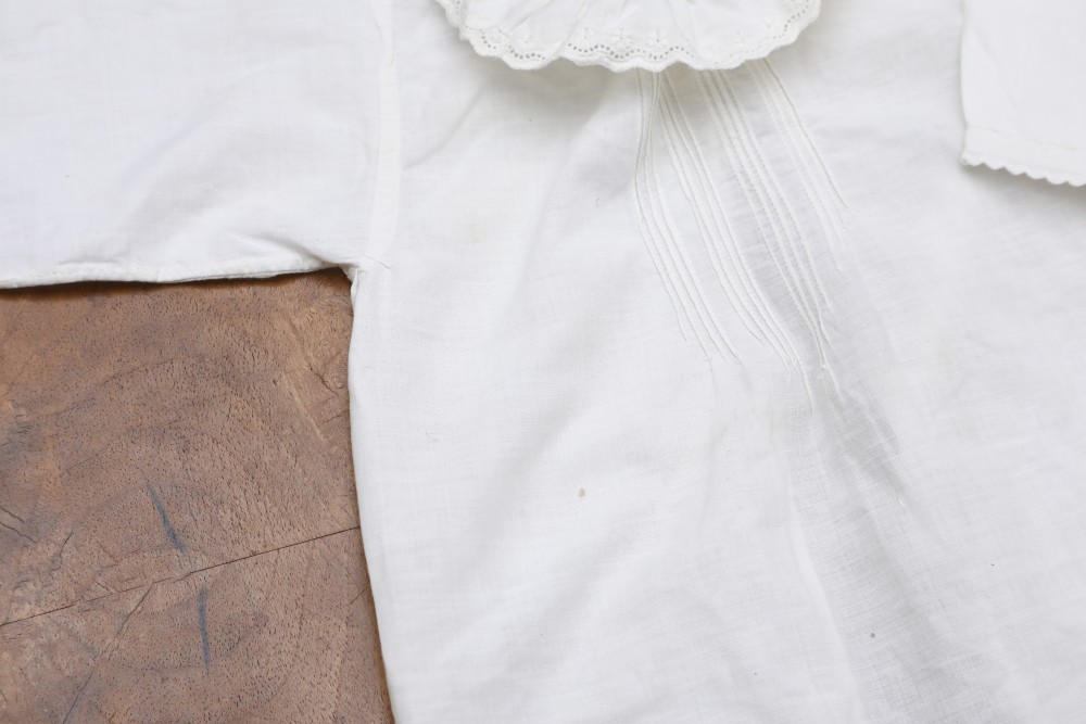 こちらはチェコのアンティークショップで20年前に入手のベビー服です。薄手の綿で、衿に小さな刺繍が施され、胸部分に飾りの縫い取りがある大変ラブリーな商品。かなり古い1920年代頃の物です。経年の風合いがありますが、保存状態も良く状態は良好です。後ろの肩でリボンを結んで着せるタイプの裁断で昔ならでは。シンプルな清々しい形です。アンティークならではの繊細さが感じられます。穴あきなどありませんが小さなシミの点が3点ございます。長い年月を経て大事に保管されてきたとっておきのアンティーク・ベビー服をチェコからお届けです。新生児用、お人形の衣装用にいかがでしょうか。