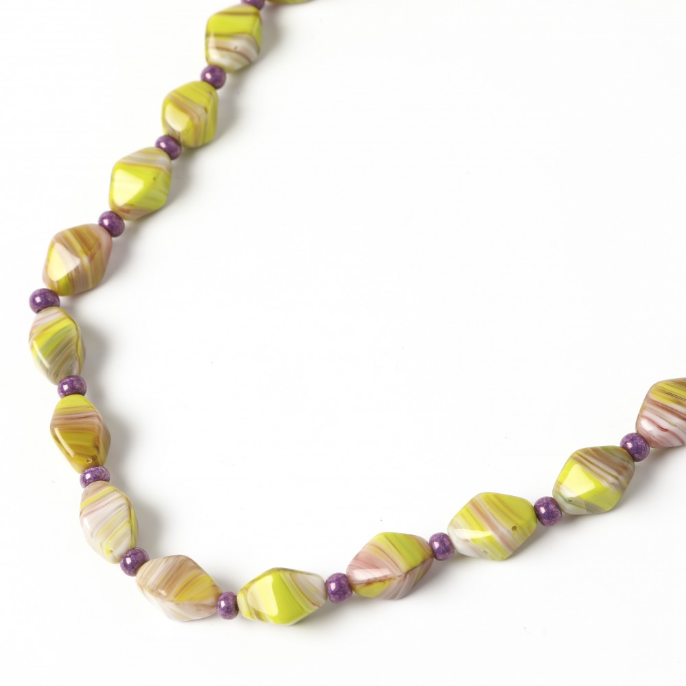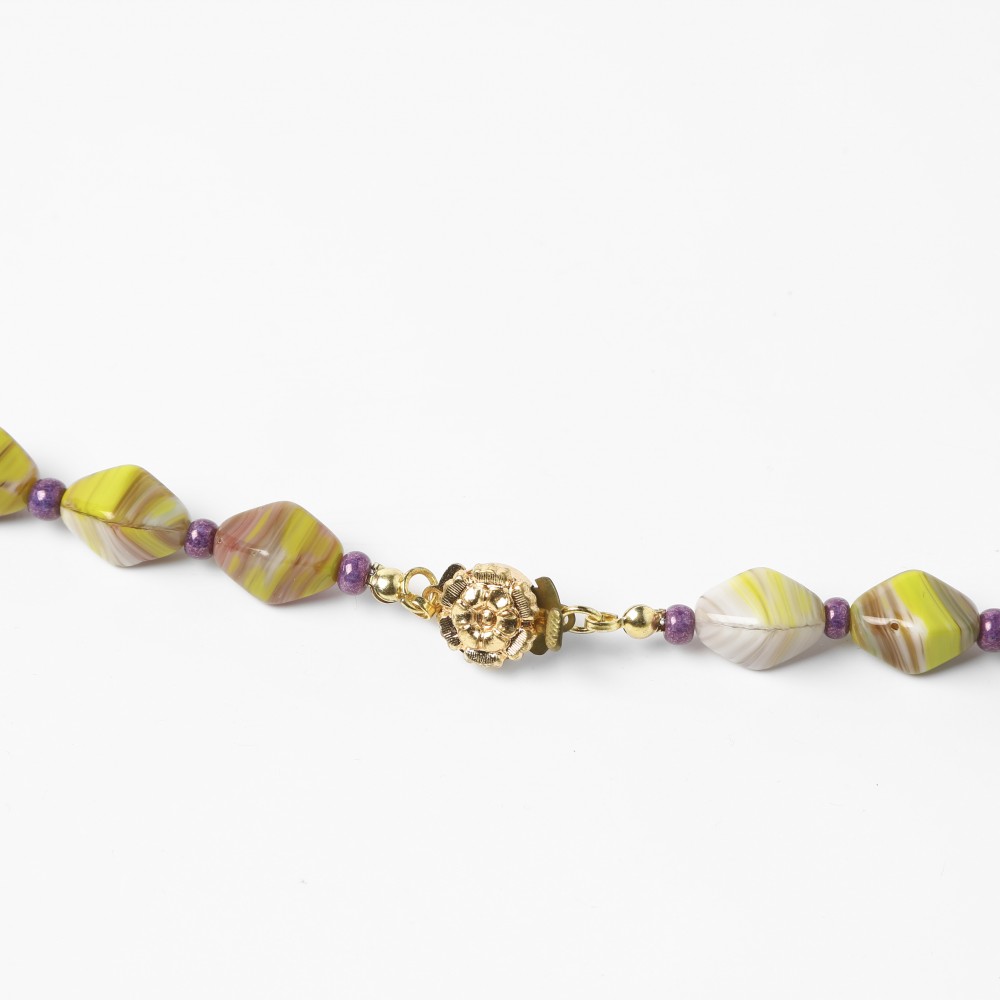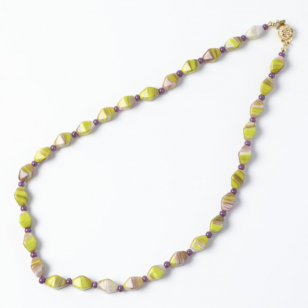 こちらはチェコスロヴァキア時代のヴィンテージ・ネックレス。1950-60年代の古いヴィンテージです。柔らかな黄緑とパープルがマーブルになったお色の不透明ガラスを使用したネックレスで、かつてチェコのビーズ工房の職人さんがハンドメイドで制作したビーズが使用されています。大きめのビーズは菱形でその合間にはシャンパンパープルのビーズが挟まれています。ビーズはシャイニーで全体で華やかなアクセントを添えています。長さは55cmです。糸とパーツは新しいものに替えてございますので、糸切れの心配などなく安心です。エレガントでレトロな雰囲気が個性的なチェコスロヴァキア時代の良品ガラスネックレスです。