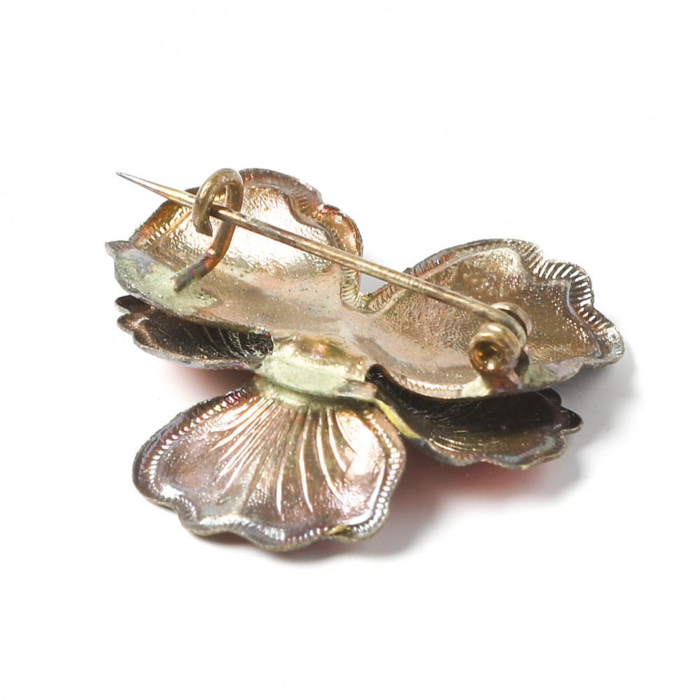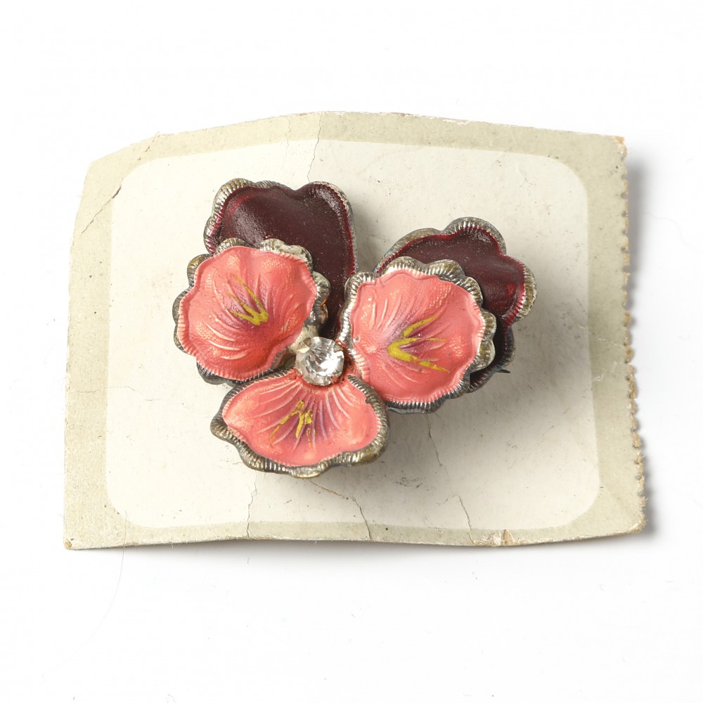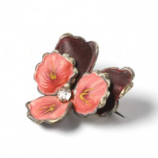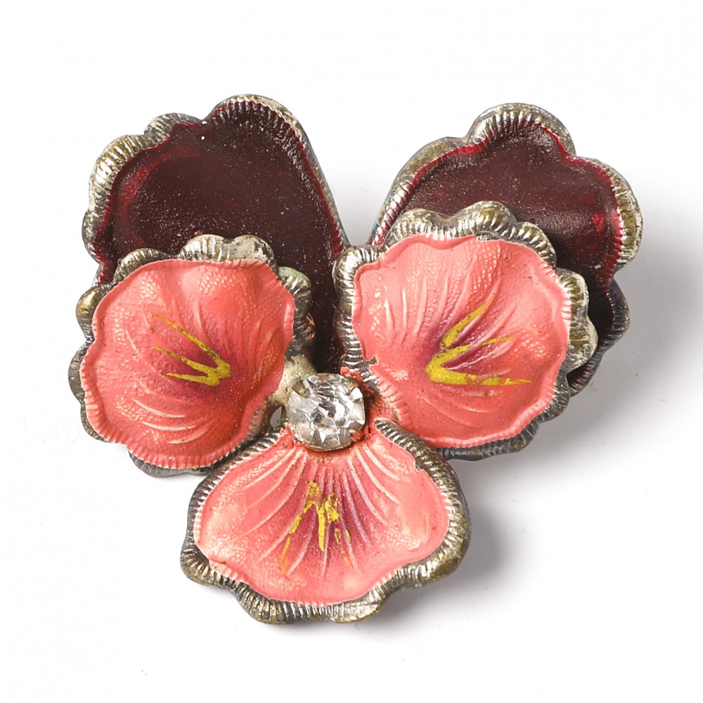こちらは100年古いアンティーク・ブローチ。パンジーがそのままブローチになった大変キュートなノスタルジックなお品です。周辺に銀彩、中央にクリスタルカットガラス、また色付けはハンドペイントで、手作りの温かみ懐かしさが感じられるアンティーク。100年古いお品です。販売用のカードにつけられたままのデッドストックです。ピンの状態も良好です。全体に経年の風合いがあります。