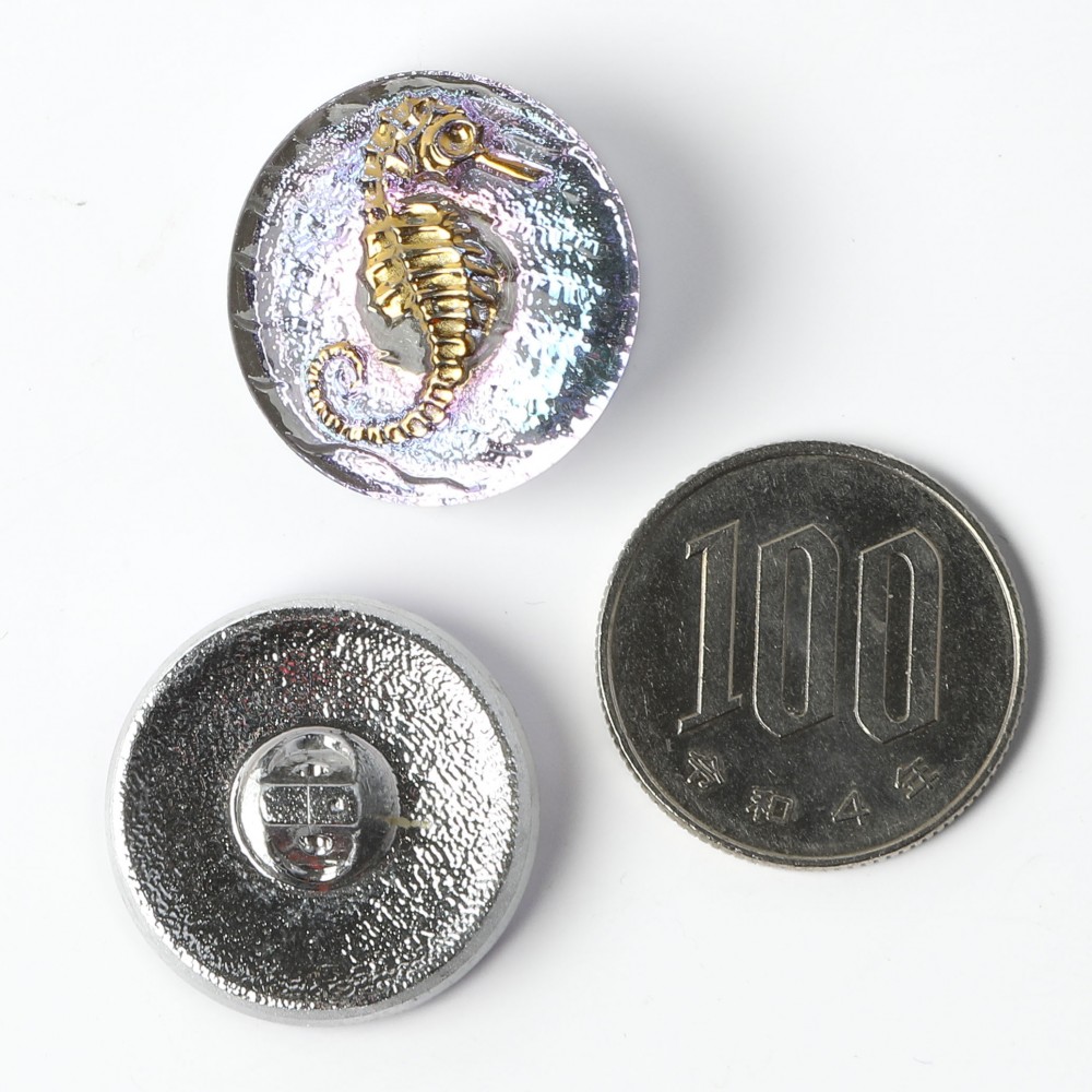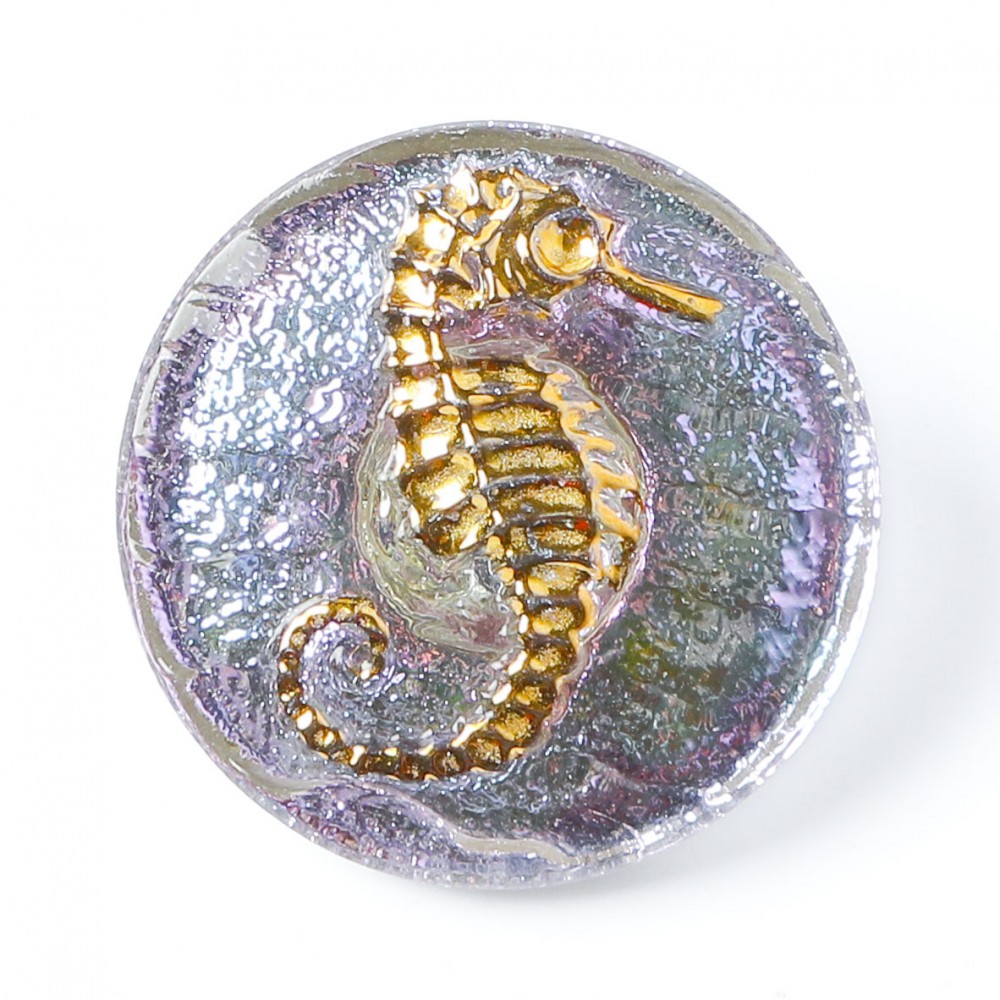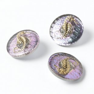 こちらはチェコのガラスボタン工房で制作されているガラスボタン。表面にはタツノオトシゴのモチーフにゴールドの塗料が塗布されていてキュートなボタンです。裏面から金属塗料が塗布され、人気のヴィトレイルカラーです。角度によってショッキングピンクも見え隠れする華やかな仕上がり。アクセサリーや留め具などにすると素敵です。