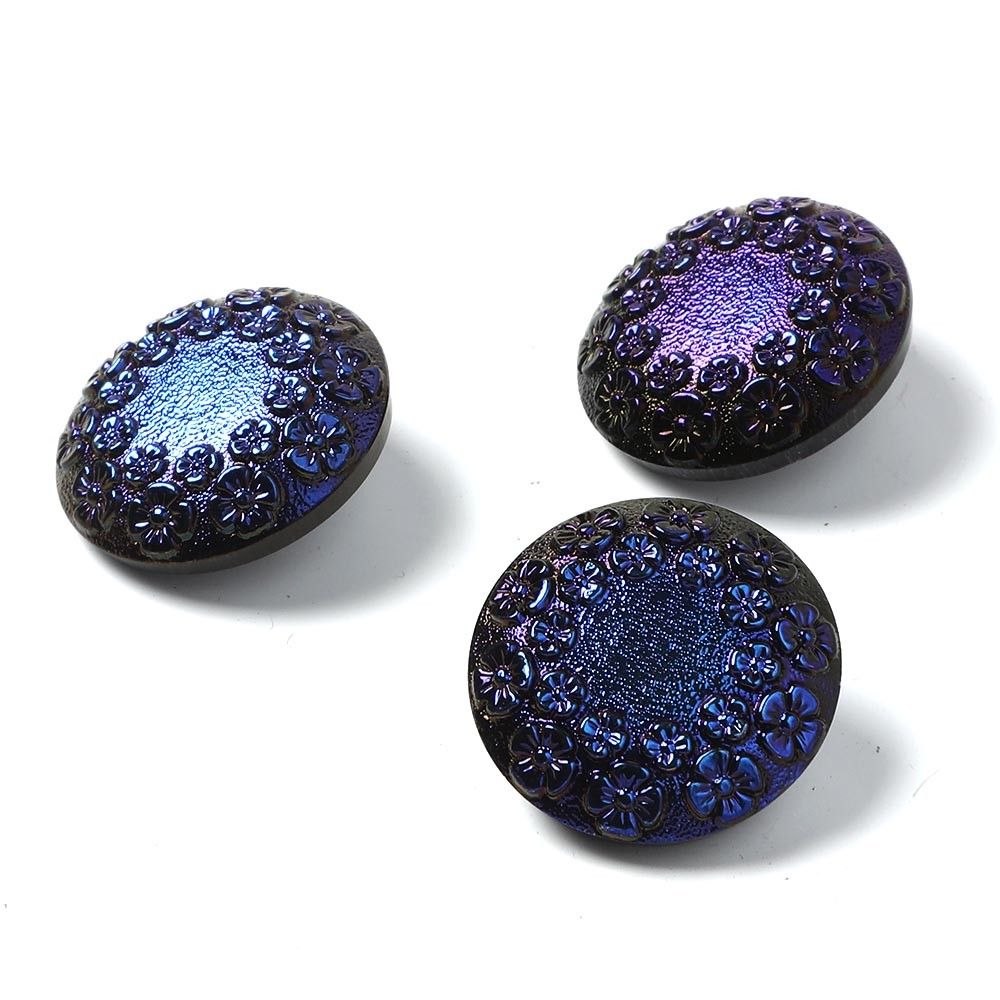 こちらは北チェコのガラスボタン工房で制作されるガラスボタン。直径2.2cmのボタンで黒いガラスを使用し、厚手のボタンです。表面には金属塗料が塗布されダークなメタリックブルーの輝き。光を柔らかく反射しシックでノーブルな雰囲気です。アクセサリーの材料としてもおすすめです。