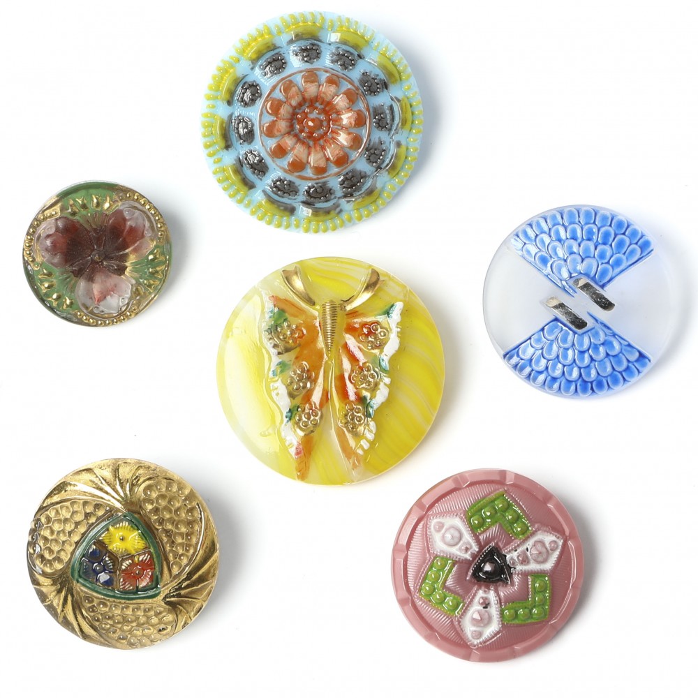 こちらはバーボフカで長年集めてきたガラスボタンを六個セットにしたものです。一番古いボタンは鱗模様のブルーのペイントが施された磨りガラスのボタン、こちらは大変モダンなデザインですが100年古いアンティークです。その他、ピンクやブルーの不透明ガラスを使用したペイントの楽しいヴィンテージのガラスボタン。チェコでもほぼ入手できない大変貴重なお品です。状態もそれぞれとても良いものです。