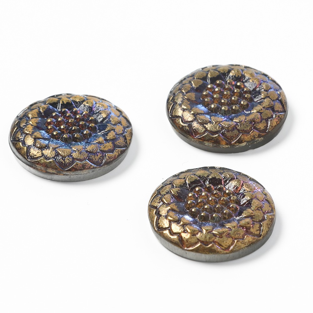 こちらはチェコのガラスボタン工房からのガラスボタン。厚みのある2.3cmのカボションで、ひまわりのモチーフのものです。裏から金属塗料が塗布され、奥行きのあるブルーのお色です。角度によって少しピンクや紫のニュアンスもあります。アクセサリーの材料などにおすすめです。