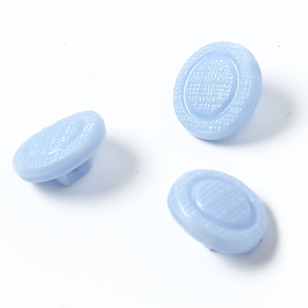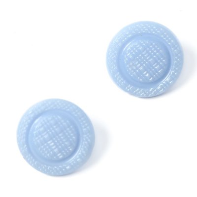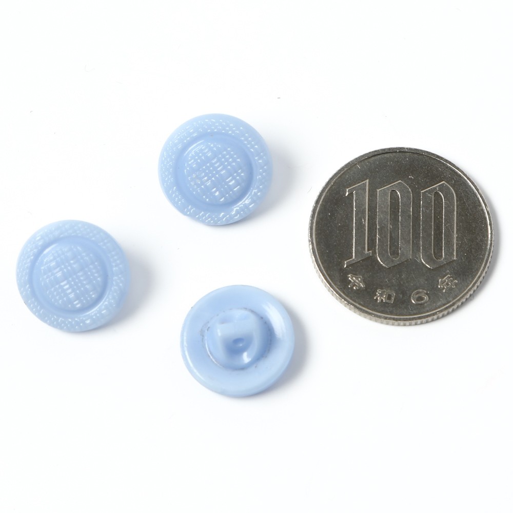 こちらはかつてのガラスボタン工房から直接譲っていただいたヴィンテージのガラスボタン。今では貴重な水色の不透明ガラスを使用したものです。表面には布目のような模様が入ったレトロな雰囲気が素敵なボタンです。現行では手に入らない貴重なお品です。2つセットのお値段です。