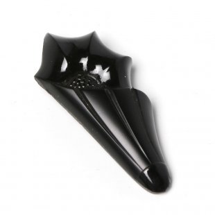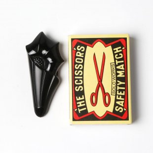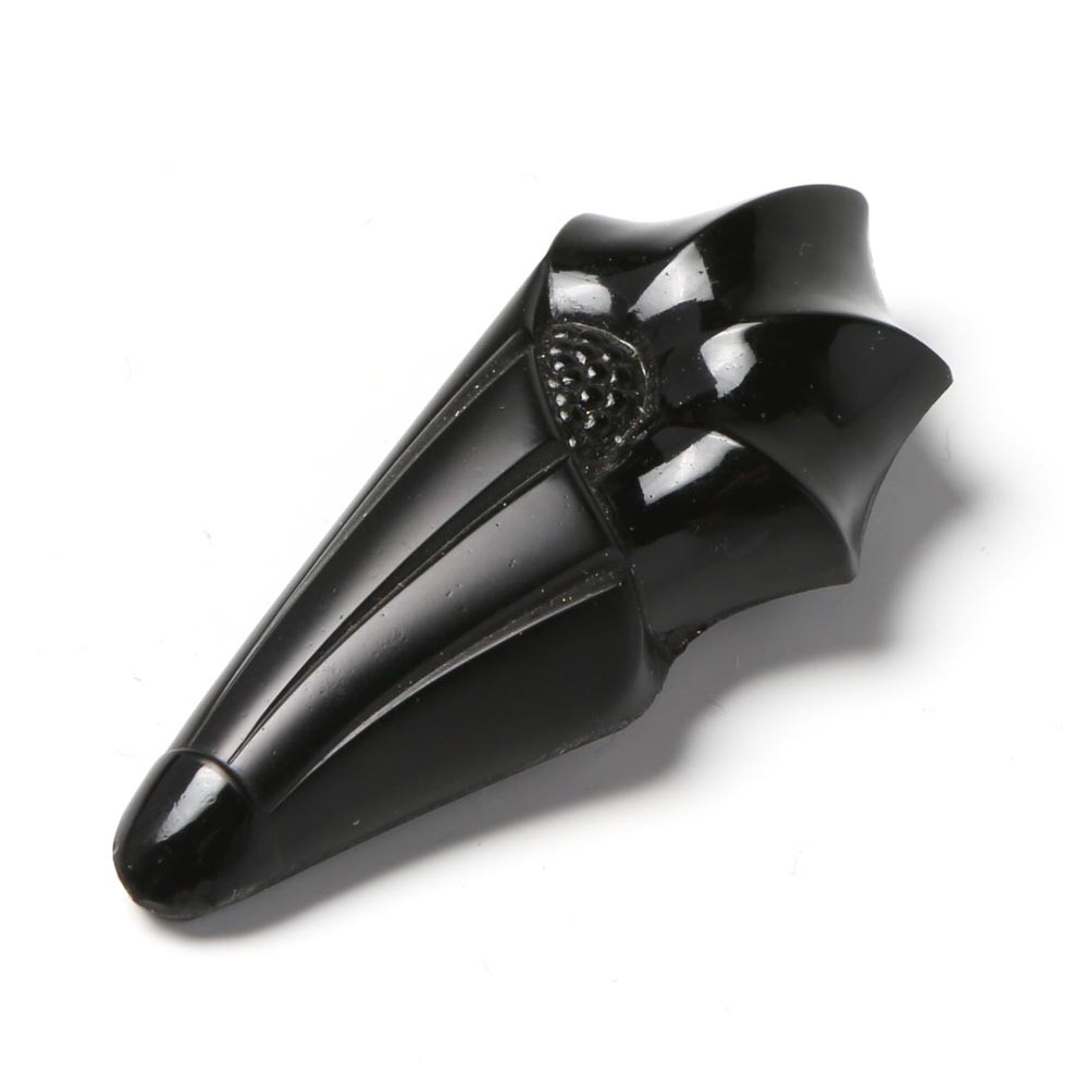 こちらは20世紀初頭のアール・デコのガラスブローチ。この当時からチェコではよく見られる漆黒のガラスジェットガラスを使用した貴重なお品です。(ジェットガラスはジェット(1億8,000万年前のジュラ紀の流木の化石を使ったコンポネント)を模して作った黒ガラスのことで今では生産できないガラスです。)傘の先とお花のコンビネーションでとても斬新なデザインです。ポケットや帽子のリボンなどに刺して使用したもので、クリップタイプのブローチです。マットな部分と光沢のある部分が分かれていて、製作者のこだわりを感じます。帯留めなどにも良さそうです。時代を超えたデザイン性の高い逸品。クリップの状態も含め全体的に状態は良好です。