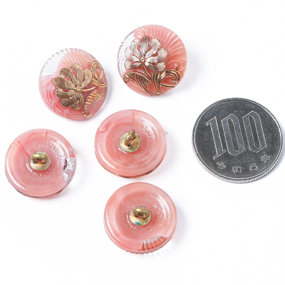こちらはチェコのガラスボタン工房で製作されている手打ちのガラスボタンです。直径が約1.8cmあります。ミルキーピンクとクリアのマーブルの入ったガラスを使用し、表面には優雅なお花のモチーフがゴールドで施された美しいボタンです。優しい雰囲気のキュートな仕上がりです。こちらのボタンは正面から見てクリアなガラスが一部入っていますので、全体がピンクではありません。全ての写真を参照の上お求めください。