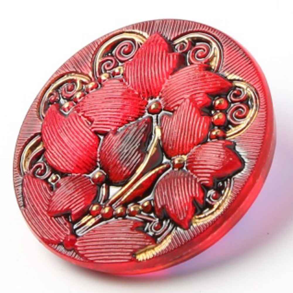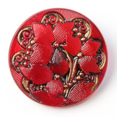 こちらはチェコのガラスボタン工房で制作されたガラスボタン。ブローチのような存在感の豪華なガラスボタンです。表面には桔梗のモチーフが施されています。ワインレッドの赤いガラスを使用し、裏からはうっすら金属塗料で裏打ちされているため、赤の反射が奥行きのある深いお色になっています。コントラストをつける黒の顔料と金彩も手作業で行われています。存在感があり華やかでシックなボタンです。