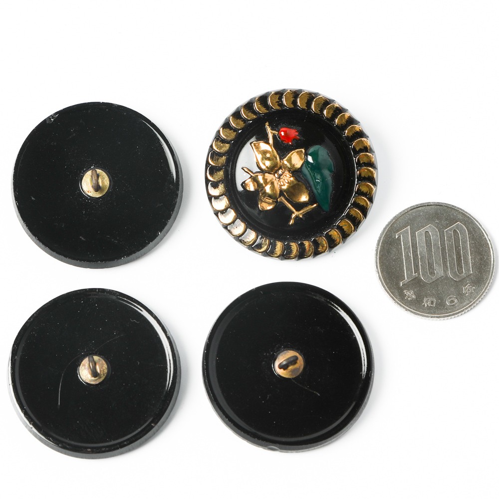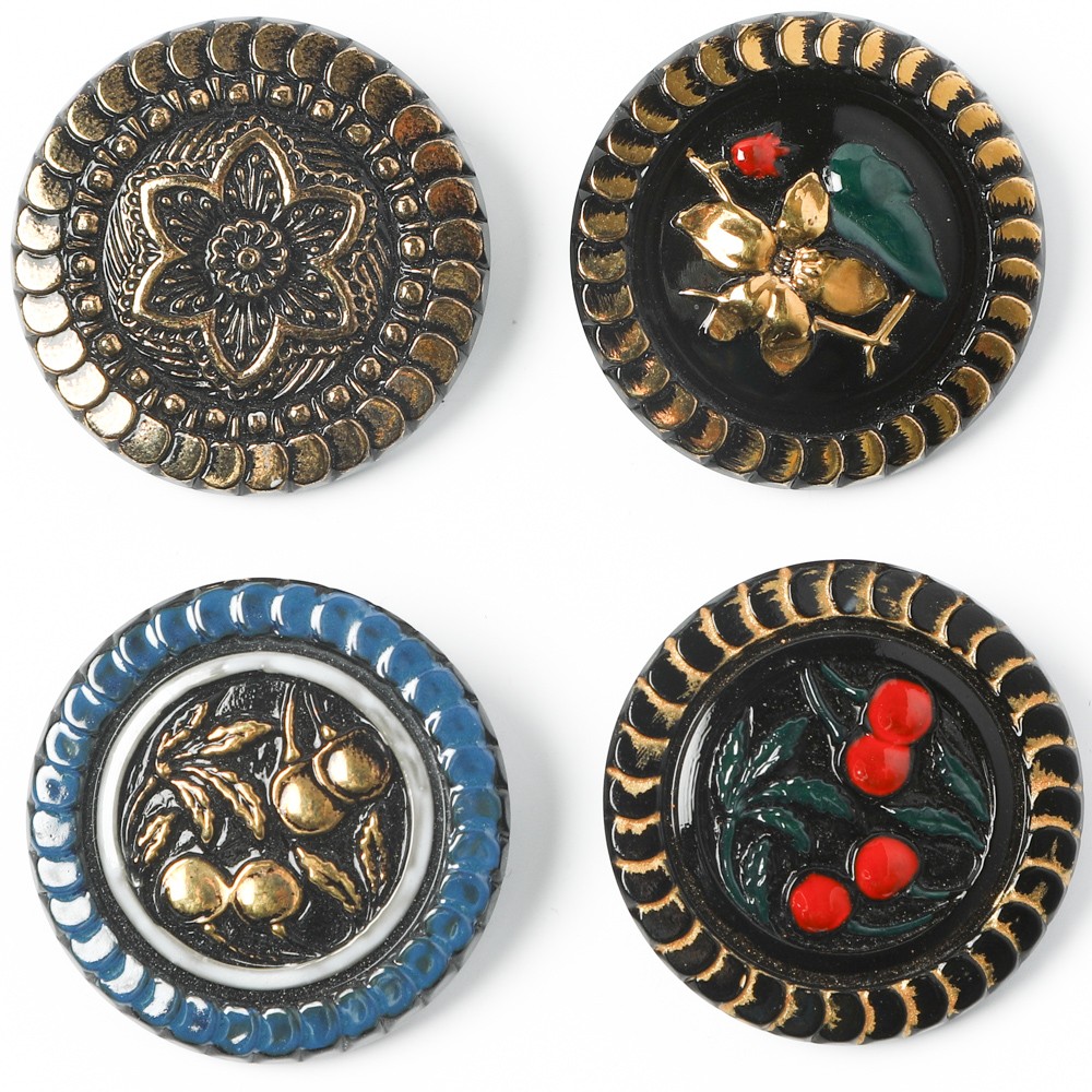 バーボフカのコレクションの中からのご紹介です。大きな3.2cmの黒いガラスを使用したガラスボタンで、表面にはさくらんぼや植物の模様が施されたもので、デザインやペイントの異なるものを4つセットにいたしました。周辺にはゴールドやブルーのペイントが施されています。こちらは2つの型を使用して制作する特にこまのかかっているボタンで、バーボフカでは在庫もひとつずつしかありません。昔懐かしい雰囲気が可愛らしいガラスボタンです。手作りの雰囲気も楽しめます。髪留め、帯どめ、留め具、ブローチなど、使い方はアイディア次第でいろいろです。