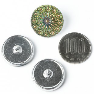こちらはチェコのガラスボタン工房で製作されている手打ちのガラス・ボタンです。直径が約2.2から2.3cmあります。一つ一つ打ち出しや彩色も職人さんの手作業で行われています。夜空に打ち上がった花火のような模様が華やかなガラスボタンです。裏からは金属塗料が塗布され、奥行きのある若葉色です。角度によってブルーやパープルなどの全く違ったお色を見せます。金彩も施され、豪華な仕上がりです。