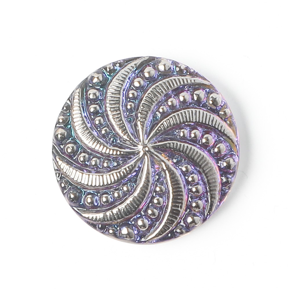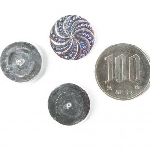 こちらはチェコのガラスボタン工房からのカボション。渦巻きの模様のカボションで、裏から金属塗料が塗布されペールパープルのお色です。ほんの少しですがブルーのお色とのグラデーションが入っています。渦の部分はシルバーです。奥行きのある柔らかな透明感が楽しめます。