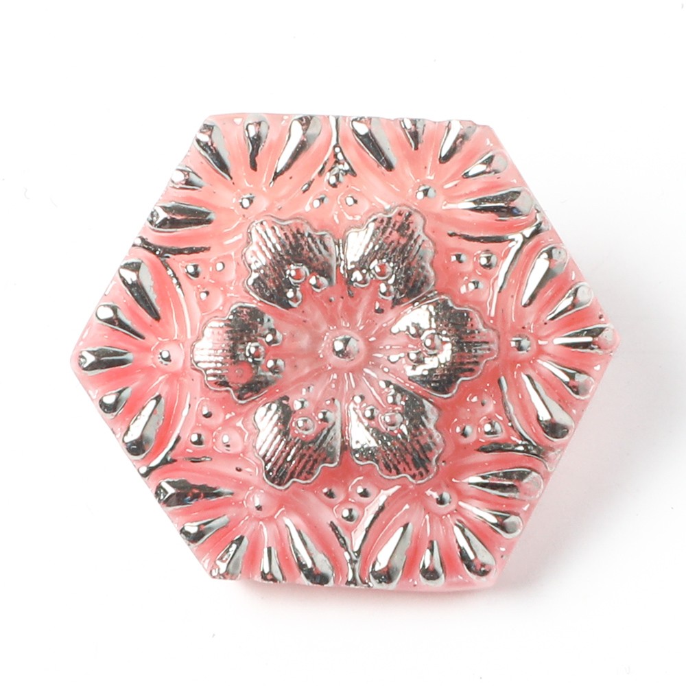 こちらはチェコのガラスボタン工房からの新作。六角形(ヘキサゴン)のフォルムのガラスボタンです。現在では貴重なミルキーピンクのガラスを使用しています。表面には繊細な放射状のお花の模様にシルバーの塗料が施されています。側面はひとつひとつ人の手で研磨され、大変手間のかかっているボタンです。キュートで華やか、他ではなかなか入手困難なお品かと思います。