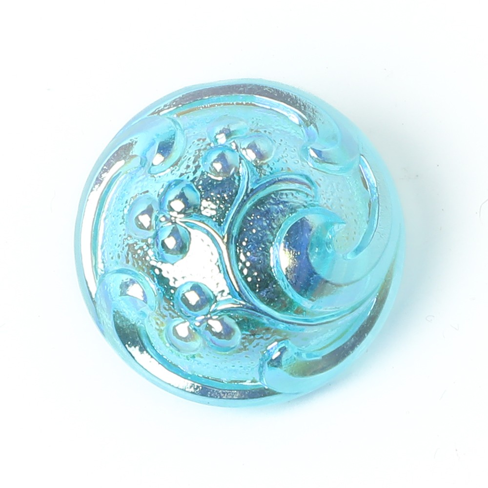 こちらは北チェコのガラスボタン工房で作られている手打ちボタン。直径が約1.8cmのボタンです。こちらのボタンは、透明の水色のガラス製で、中央が盛り上がったポッコリとした形のガラスボタンです。表面にはカーブが特徴的なバロックスタイルの植物モチーフが施されています。また金属塗料が塗布され、メタリックなシャイニーブルーのお色です。優雅で美しい色味に仕上がっています。ブローチのような貫禄と華やかさがあり、アクセサリーの材料としてもおすすめです。