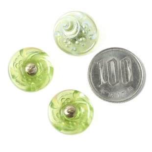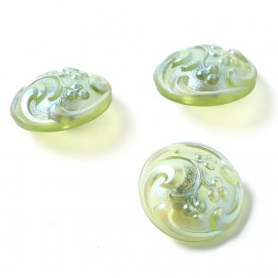 こちらは北チェコのガラスボタン工房で作られている手打ちボタン。直径が約1.8cmのボタンです。こちらのボタンは、透明の黄緑色のガラス製で、中央が盛り上がったポッコリとした形のガラスボタンです。表面にはカーブが特徴的なバロックスタイルの植物モチーフが施されています。また金属塗料が塗布され、メタリックでシャイニーなブルーグリーンのお色です。優雅で美しい色味に仕上がっています。ブローチのような貫禄と華やかさがあり、アクセサリーの材料としてもおすすめです。