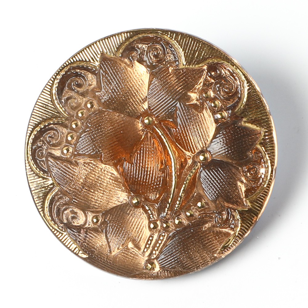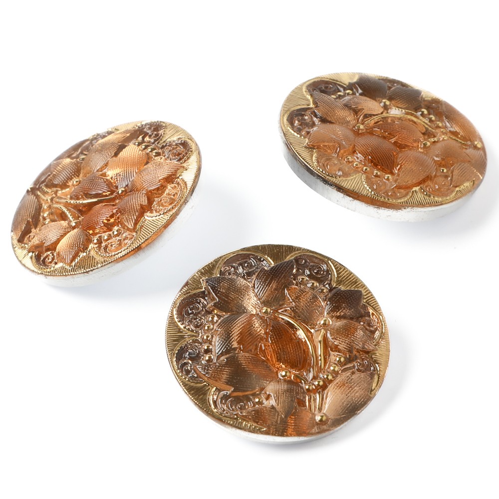 こちらは新作カラーのガラスボタン。桔梗の花のモチーフ、彩色も手作業で行われていて工芸品としての豪華ガラスボタンです。直径は2.7cmでキャメル&ゴールドのお色です。表面には金彩の塗料も施され、華やかで優しい雰囲気のガラスボタンに仕上がっています。ブローチのような存在感ですのでお裁縫のマテリアルとしても、飾りボタンとしても素敵です。髪留めや帯留めに加工するなど、アイディア次第で楽しみ方は色々です。