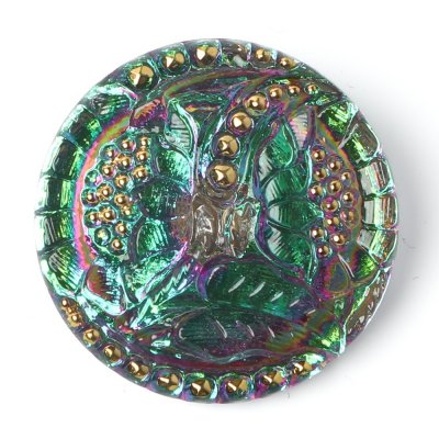 こちらは北チェコで長い間製造されてきたガラスボタンです。こちらのボタンは大きな向日葵のようなお花が2輪、ボタンの表面に所狭しと大きくデザインされています。裏から金属塗料が塗布され、お色はメタリックグリーン&ピンク色のガラスボタン。また表からは金彩で奥行きのある作りになっています。こちらのボタンはガラス本来の質感の楽しめる涼やかな印象のボタンで華やかさもあります。留め具や帯留め、アクセサリーなどにもおすすめです。