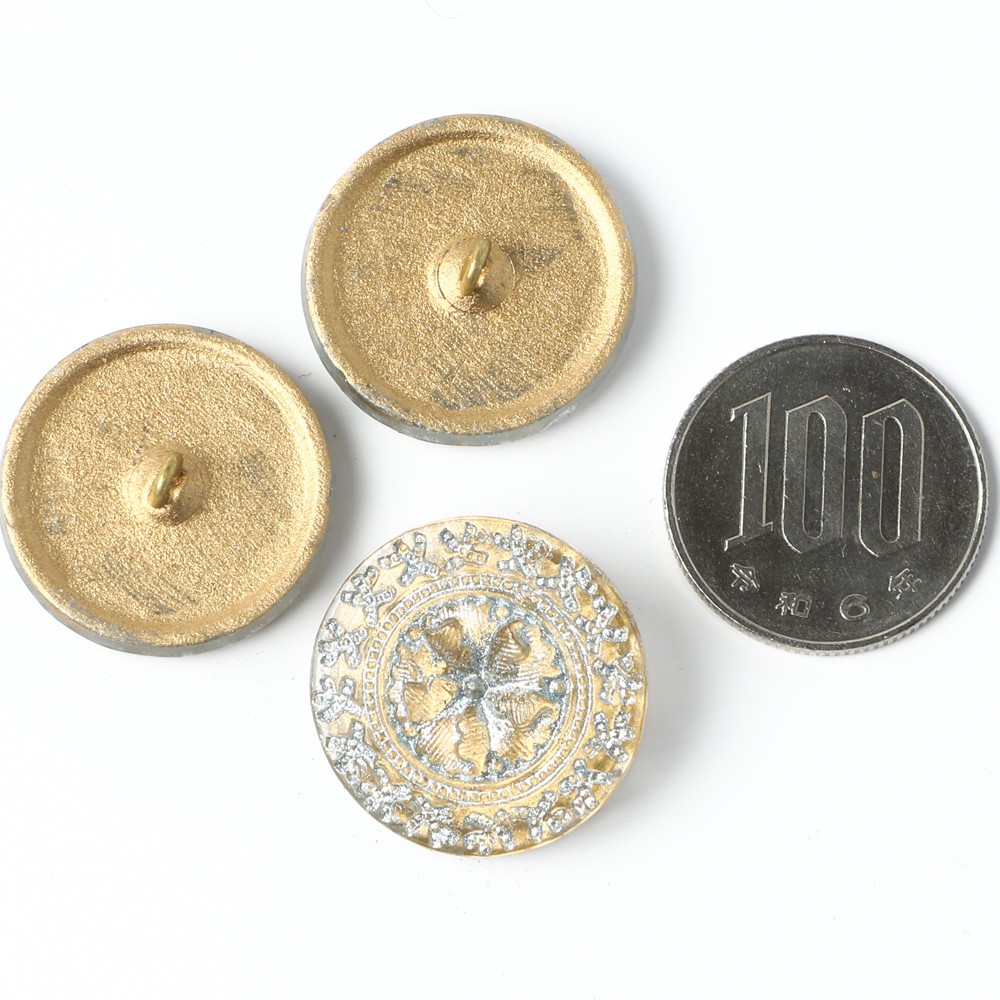 ガラスボタン工房で作られている手打ちガラスボタン。直径約2.3cm。一つ一つ打ち出しや彩色も職人さんの手作業で行われるガラスボタンです。表面にはリースやお花の細かな模様が施され、裏からマットゴールドの金属塗料が塗布されています。表面には模様の中にマットホワイトの塗料も入れ込まれ、柔らかいコントラストが綺麗です。上品で華やかな雰囲気があります。女性らしいフェミニンな一品です。一つひとつハンドペイントで丁寧に制作されたガラスボタンです。人気の再入荷のお品です。