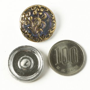 こちらは北チェコのガラスボタン工房で作られている手打ちボタン。直径が約2.3cmのボタンです。透明のガラスを使用し、表面にはバロックスタイルを思わせる優雅な植物文様が入っています。裏から金属塗料が塗布されていて、内側から深い青色をしたシックな雰囲気のガラスボタンです。角度により紫のお色なども見えます。表面はモチーフに金彩が施され豪華なボタンに仕上がっています。アクセサリーに作り変えるもの、お洋服のボタンにするのもおすすめです。