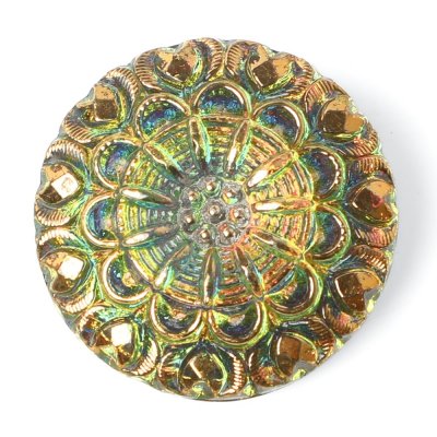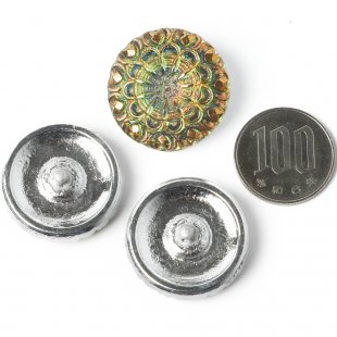 こちらは直径2.7cmのガラスボタンです。裏面から金属塗料が塗布され、淡いグリーンの美しい輝きがあります。表面には金属塗料が塗布されていて、花火のような繊細な花模様で、よく見るとハートのマークも隠れていて、華やかでキュートなガラスボタンです。角度によりピンクのお色も見え隠れします。