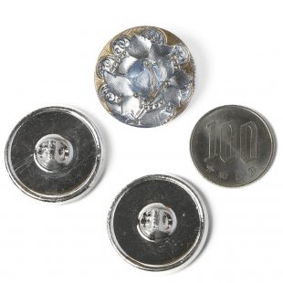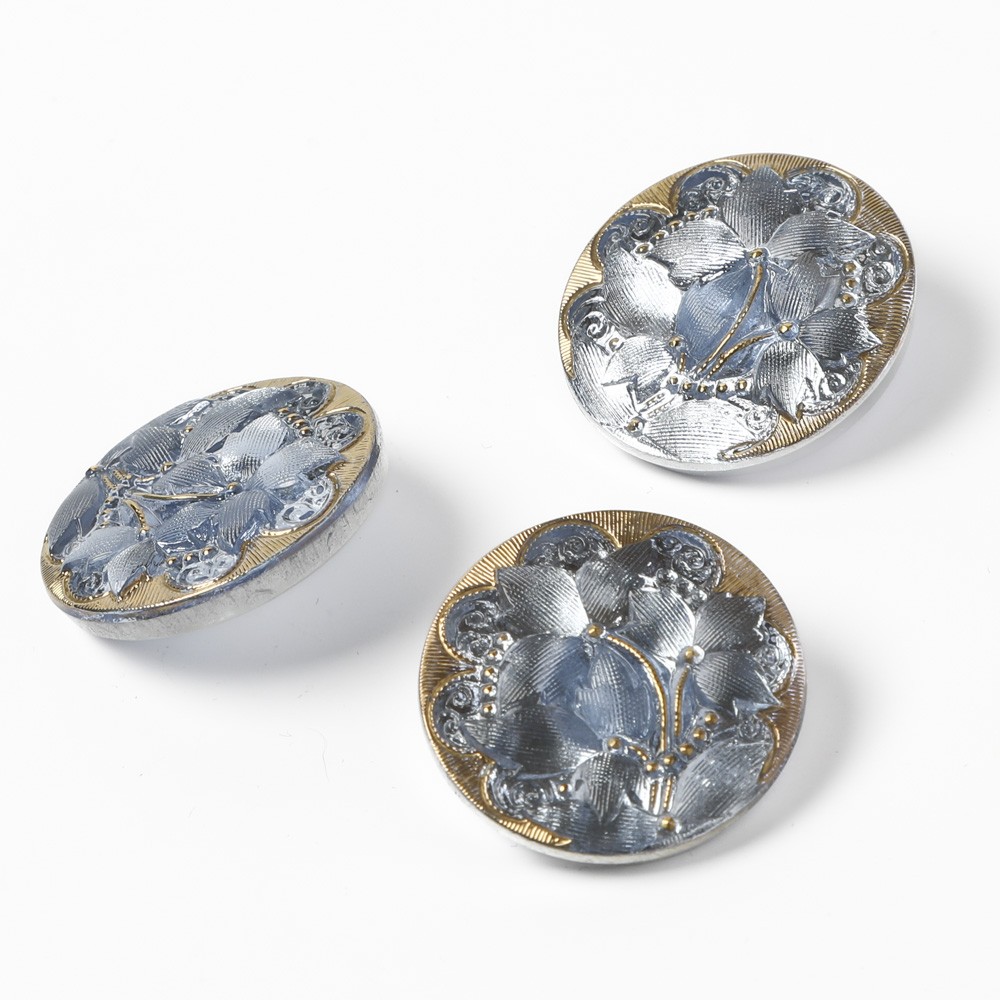 こちらは北チェコの豪華手打ちガラスボタン。桔梗の花のモチーフ、彩色も手作業で行われていて工芸品としての豪華ガラスボタンです。直径は2.7cmで裏から金属塗料で塗布され、奥行きのある涼やかなクリアブルーの輝き。表面に金彩も施され、華やかでクールなガラスボタンに仕上がっています。ブローチのような存在感ですのでお裁縫のマテリアルとしても、飾りボタンとしても素敵です。髪留めや帯留めに加工するなど、アイディア次第で楽しみ方は色々です。こちらのボタンのお色の濃淡に若干の個体差がございます。