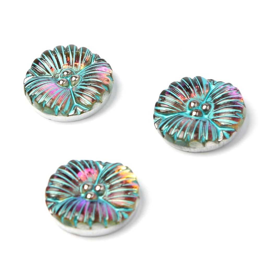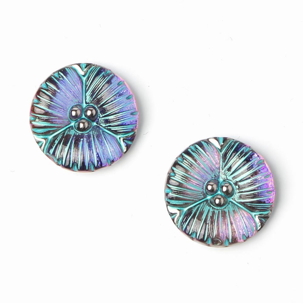チェコのガラスボタン工房で製作されている手打ちのガラス・カボションです。直径は約1.8cmです。一つ一つ打ち出しや彩色も職人さんの手作業で行われています。裏から金属塗料が塗布されているため、内部に美しい輝きを秘めたカボション・・・。お色はブルー、表面からはターコイズ・ブルーのラインが手彩色で施されています。斜めから見ると燃えるようなサンセットオレンジもお色も見えます。ふくよかなデザインのお花で、雄しべの部分に銀彩も施され上品で華やかです。