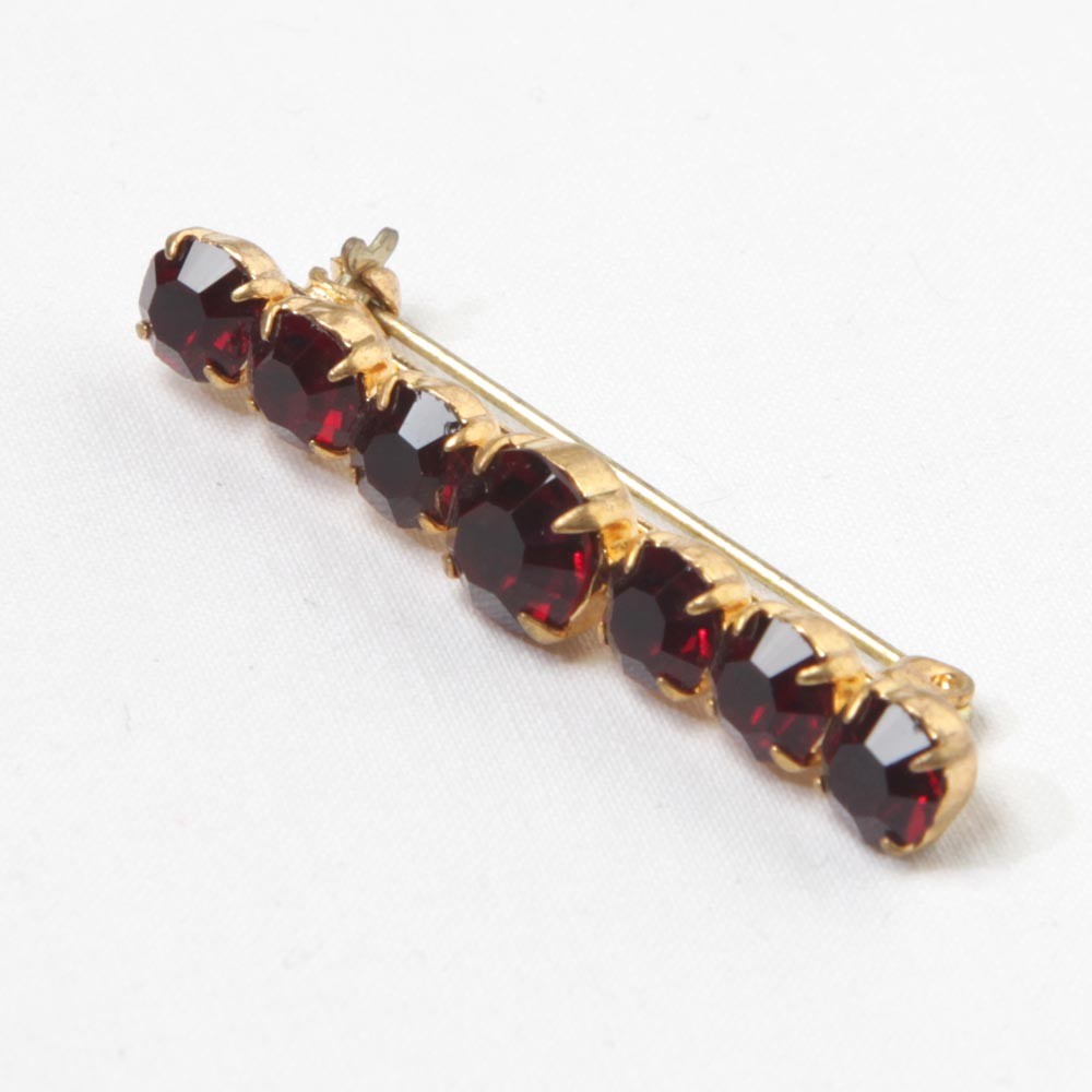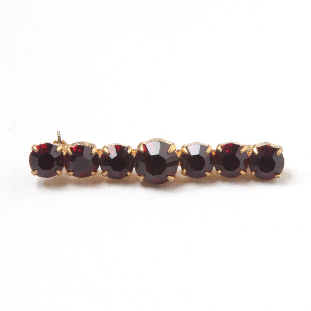 こちらはチェコ・ガラスの街ヤブロネッツからのカットガラスのブローチ。かなり濃い色のワインレッドのカットガラスが両サイドの3つずつ、大きめのガラス玉が中央に一つ埋め込まれたとてもシンプルなデザイン。一列にガラス玉が配置され、キリッとした表情のブローチです。帽子に付けたり、シャツに付けたりするととてもおしゃれ。こちらはデッドストックで入手の商品ですが、金属部分に極細かい錆のような点が見られます。付ける布を汚すほどではありません。写真でご確認下さい。ピンの状態などはもちろん良好です。